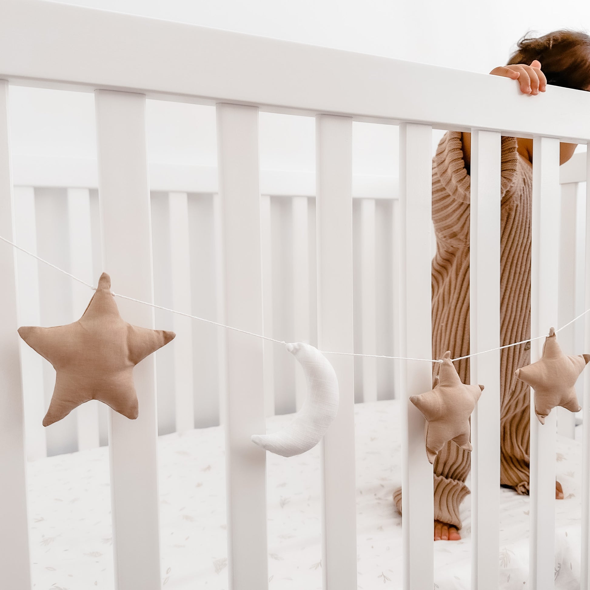 Important Information: Plush moons measure 10cm approx., stars are 11cm approx. Full length of garland is 1.8m including 10 x pieces. Due to all products being handmade please allow 1-2cm variance.