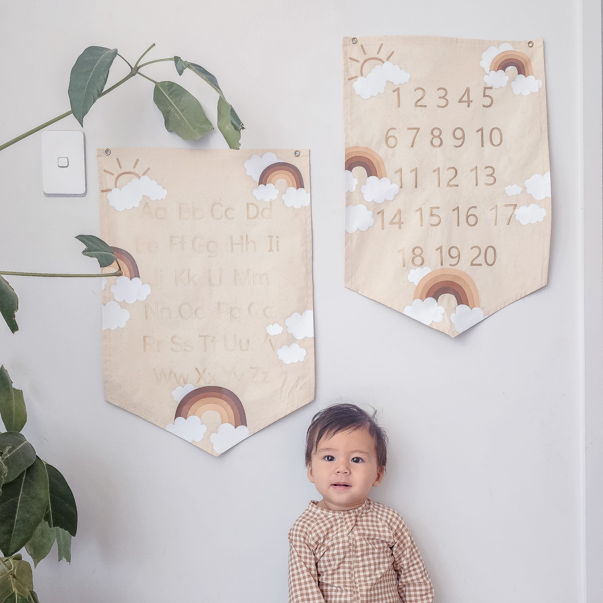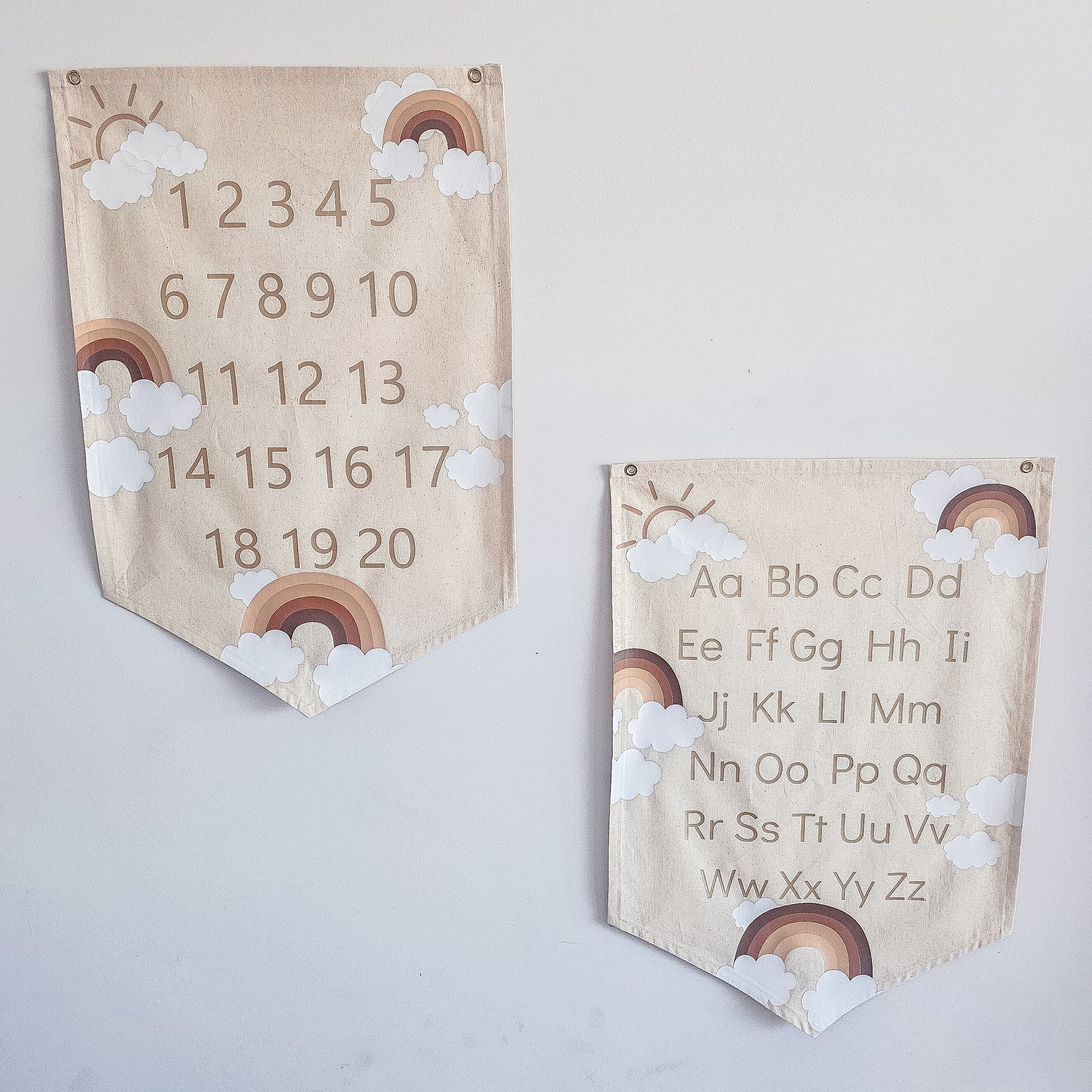 Introduce educational and fun elements into your child's play and bedroom decor with ABC Banners. Featuring a rainbow design, our banners showcase both lower and upper case letters also available numbers 1-20 for learning opportunities. Inspire creativity and learning with our playful yet informative banners. Range of colour options to suit your style and themes.