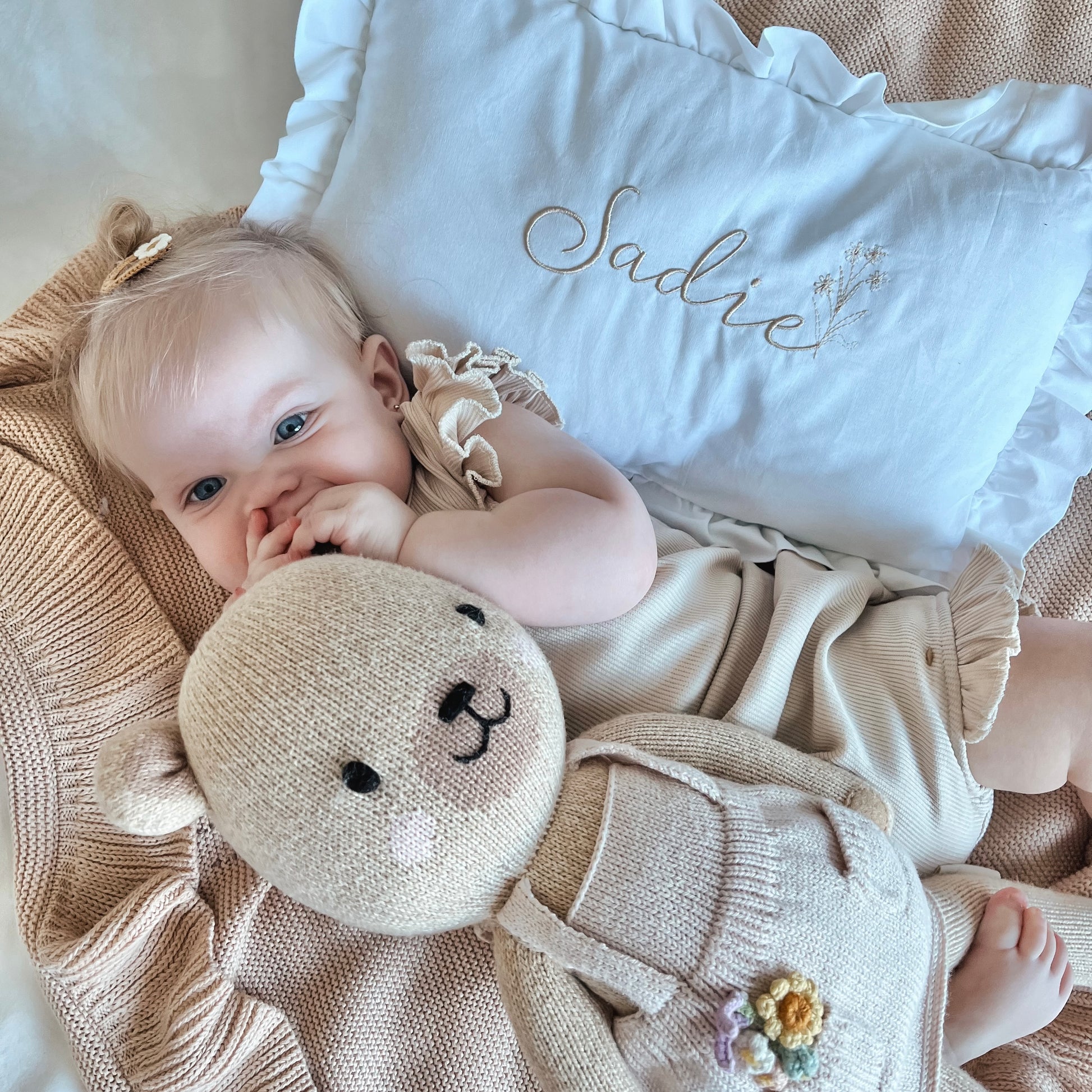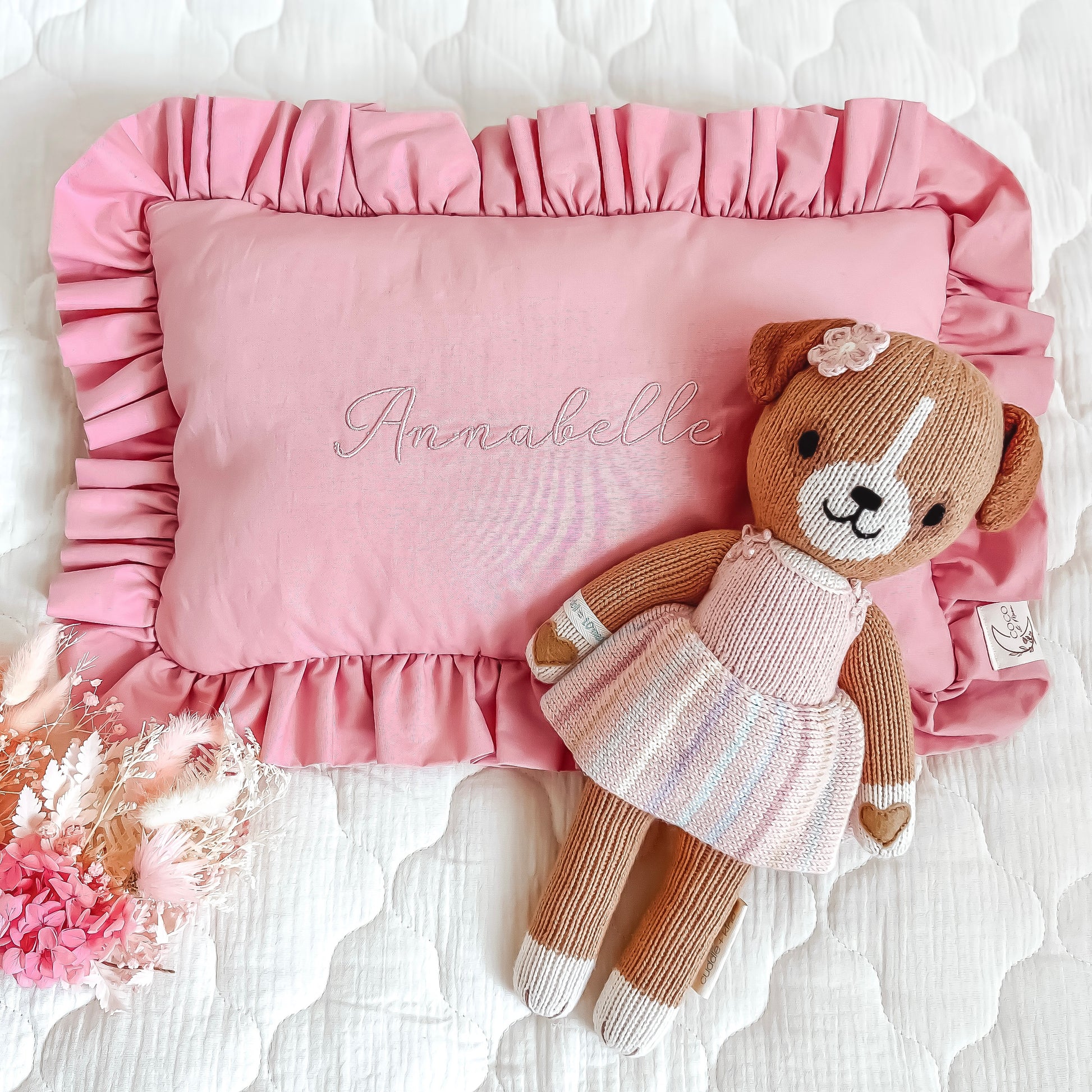 Elevate your child's room decor with our luxurious Royal Cushions. These handmade cushions feature delicate frill detail and can be personalised with an embroidered name, text, and or picture of your choice. Made from soft cotton, our cushions provide both comfort and style for your little one's space.